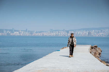 man walking alone in empty dock in the sea of marmara with city at the background