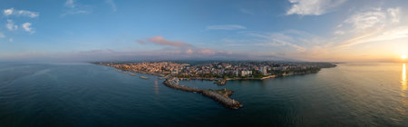 Aerial panoramic view of a coastal city at sunset.