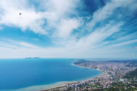 Athlete paragliding against the backdrop of a cloudy sky over the city on a summer day. Albania
