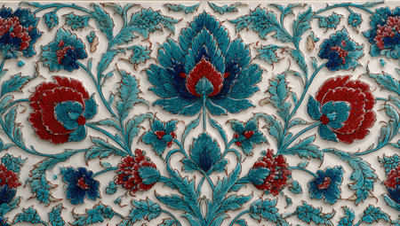 Detailed floral design with blue and red flowers surrounded by lush green leaves, highlighting traditional artistry and craftsmanship in decorative patterns