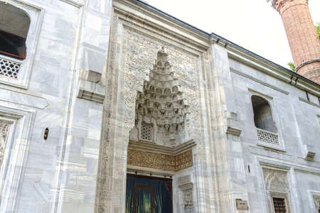 BURSA, TURKEY - JUNE 23, 2018 : Close up view of Bursa Green Mosque. It is famous with its Islamic art tiles in blue green color.