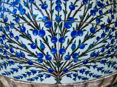 Ancient pattern on ceramic tiles wall in the park; Turkish artistic wall tile - floral pattern.