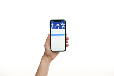 MYKOLAIV, UKRAINE - JULY 9, 2020: Woman holding iPhone X with Facebook app on white background, closeup