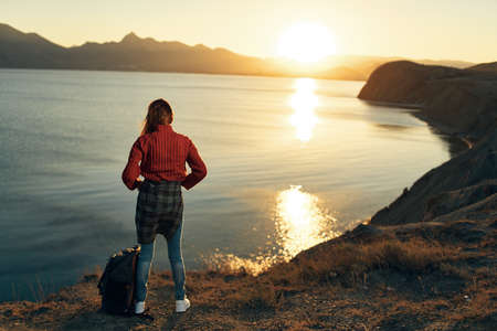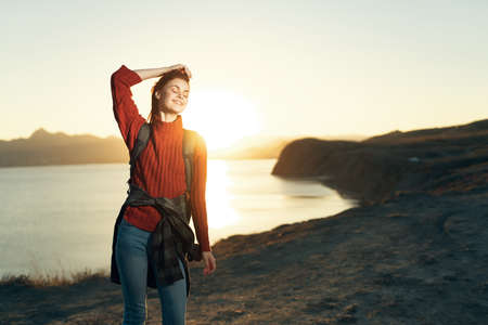 woman in a red sweater in the mountains on nature and a backpack on her back blue sea sky autumn