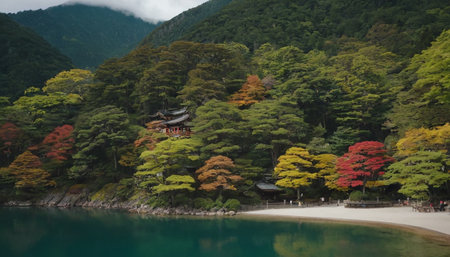 A tranquil Japanese temple nestled amidst vibrant greenery, showcasing exquisite architectural details and natural beauty, perfect for serene retreats.