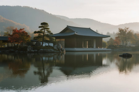 A peaceful garden features a calm pond with reflections, surrounded by trees and traditional architecture.