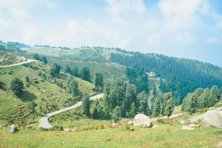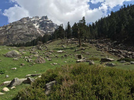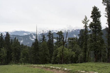 View of alpine meadows & coniferous enroute to Prashar Lake trekk trail. It is located at a height of 2730 m above sea level surrounded by lesser himalayas peaks near Mandi, Himachal Pradesh, India.