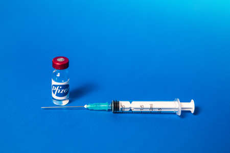 MADRID, SPAIN - JAN, 25, 2021: Vial with Pfizer company logo filled with Covid-19 vaccine and syringe on blue background