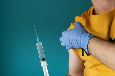 Hand with a glove rolling up the sleeve of the t-shirt of a caucasian man on a turquoise background being prepared to receive a vaccine with a syringe