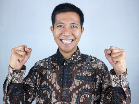 Happy expression of asian man wearing batik clothes while clenched fist showing success gesture