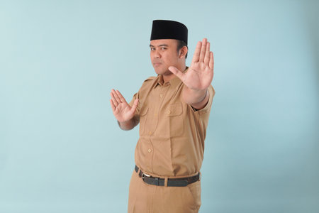 government worker man wearing with khaki uniform make a refusing pose PNS, ASN civil servant concept.