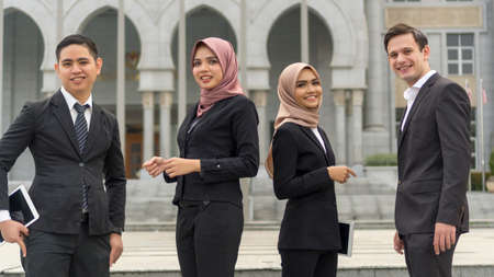 Group of Young Asian Malay Executive at the park wearing suit outdoor holding phone