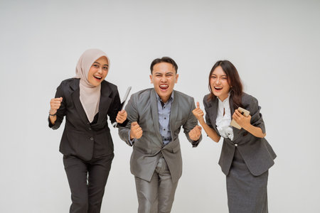 Two excited Indonesian government workers wearing blue batik uniform raising fist with a happy successful expression. PNS and civil servant concept.