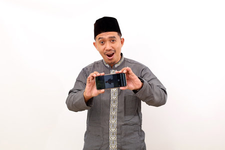 Happy asian muslim man standing while showing blank cell phone screen. Isolated on white background