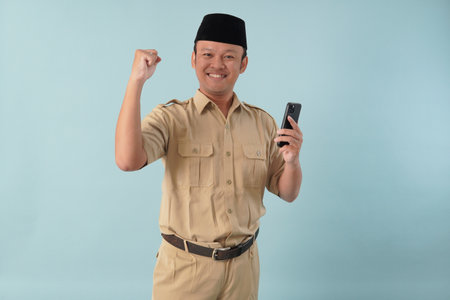 Indonesian government worker man wearing khaki uniform holding smartphone with a happy successful expression. PNS civil servant concept.