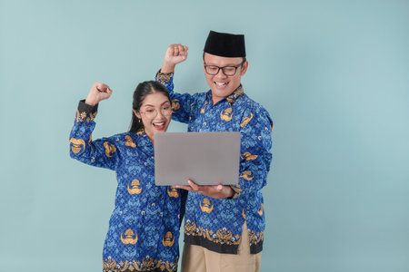 Two excited Indonesian government workers wearing blue batik uniform holding laptop with a happy successful expression. PNS and civil servant concept.