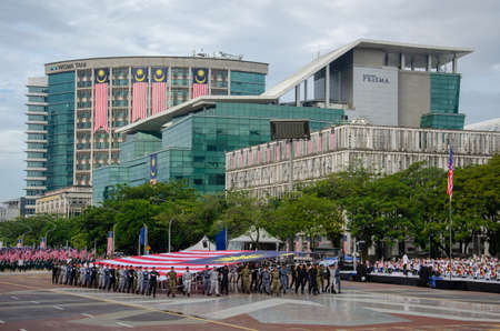 Dataran, Putrajaya/Malaysia - Aug 29 2018: Civil servant in procession carry large Malaysia flag.