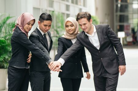 working together or team work concept.Group of young business people with suit putting hands on top of hands.