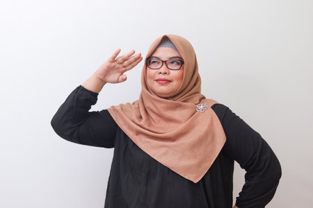Portrait of cheerful Asian woman with hijab looking far away distance. Isolated on white background