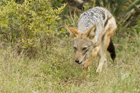 black backed jackal walking in long grass hunting for its young