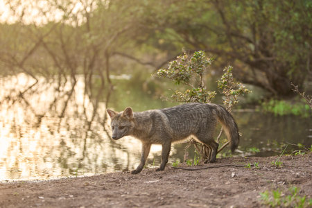 Crab-eating fox, Cerdocyon thous, beside a stream, at dawn. Tranquil scene of a wild animal in its habitat, fauna of El Palmar National Park, in Entre Rios, Argentina.