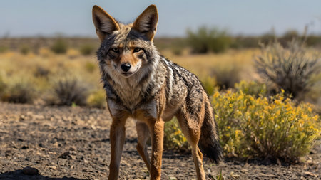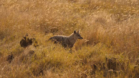 Coyote stands sideways in the thickets of dry grass of the African savannah