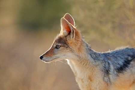 Portrait of a black-backed jackal (Canis mesomelas) in early morning light, Kalahari desert, South Africa