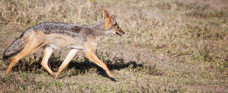 A Black-Backed Jackal runs on the savanna. Serengeti National Park, Tanzania