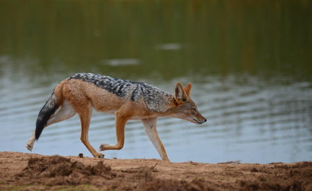 Blackback jackal animal hunting around waterhole dirt road in wildlife park reserve