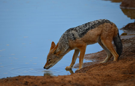 Black-backed jackal (Canis mesomelas) drinking water at a waterhole