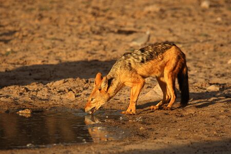 Black-backed Jackal (Canis mesomelas) drinking water in Kalahari desert in sunset. Evening sun.