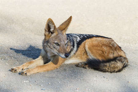 The black-backed jackal (Canis mesomelas) in Kalahari desert in morning sun. The black-backed jackal has a rest in Kalahari desert.