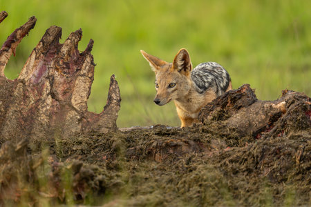 Black-backed jackal stands looking over hippo carcase