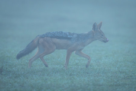 Black-backed jackal walks through fog licking lips