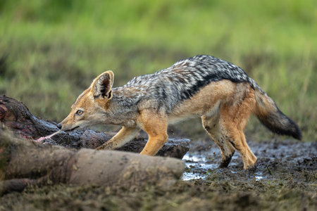 Black-backed jackal stands pulling at hippo carcase