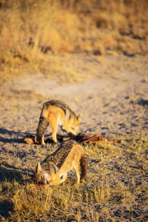 Two jackals in a dry, grassy landscape scavenging from a carcass during golden hour. Their natural camouflage blends into the dusty surroundings, highlighting survival instincts in the wild.