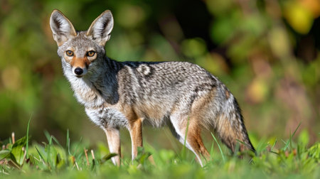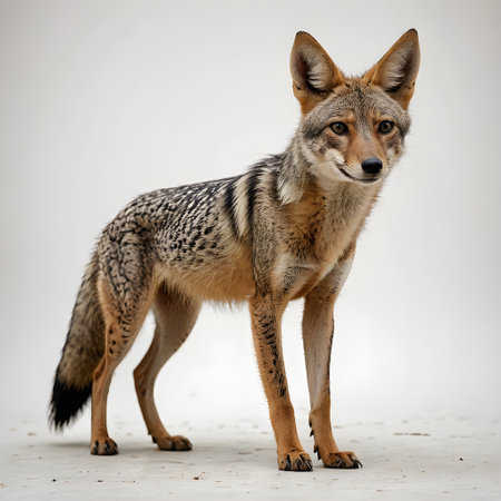 In a serene morning landscape, a striking jackal with a sleek coat pauses to gaze curiously. Soft light filters through trees, illuminating its elegant form and vibrant fur tones.