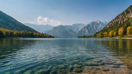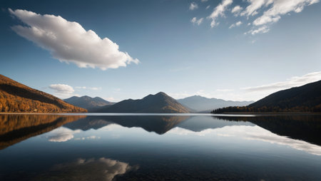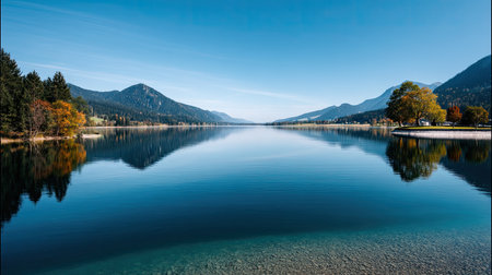 Experience the beauty of a tranquil autumn landscape featuring a mirror-like lake surrounded by majestic mountains and vibrant foliage under a clear blue sky.