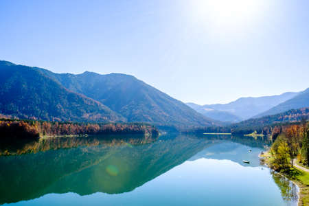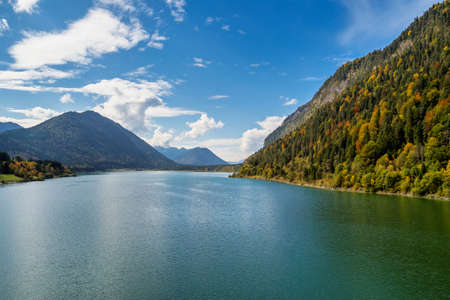 Sylvenstein reservoir lake in autumn, near Bad Toelz, Bavaria, Germany, Europe
