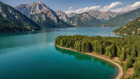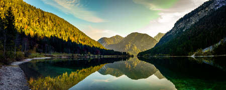 Panoramic view of beautiful mountain lake in Alps, Austria.