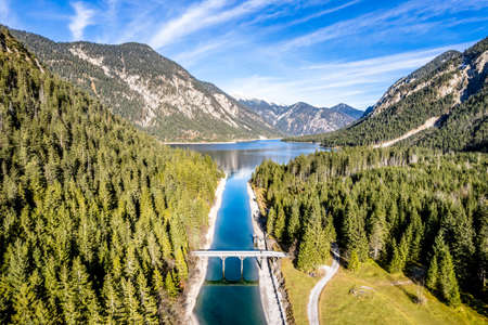 aerial view to channel bridge between lake heiterwang and plansee at fall