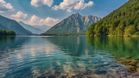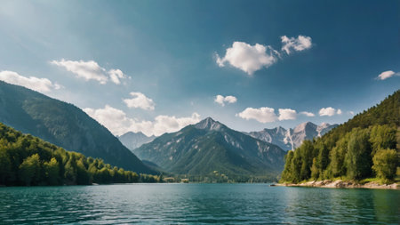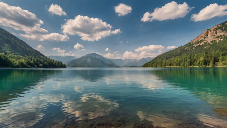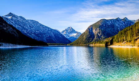 reflections of mountains in lake plansee in spring at austria with blue cloudy sky