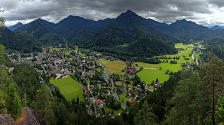 Aerial view of a small town nestled in a valley surrounded by mountains and green fields