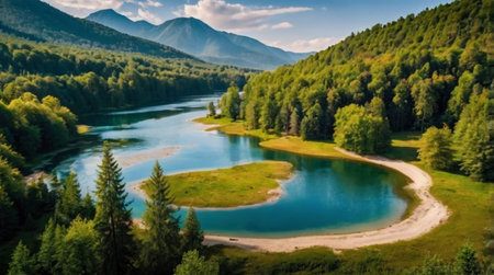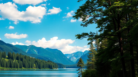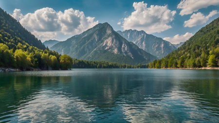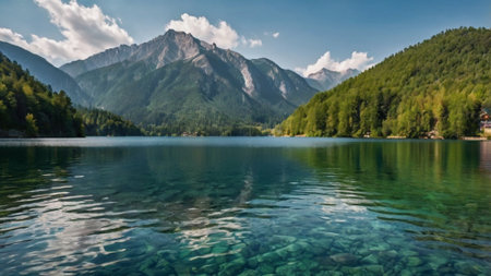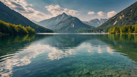 A stunning view of a serene mountain lake under a clear blue sky. The calm water reflects surrounding trees and mountains, creating a peaceful natural scene.