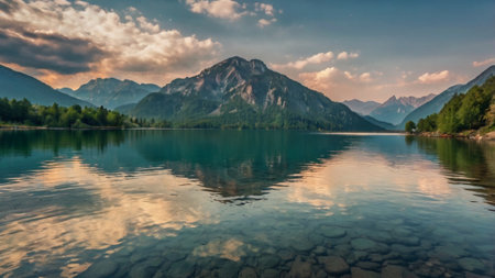 Mountain lake at sunset. Beautiful summer landscape with mountain lake.
