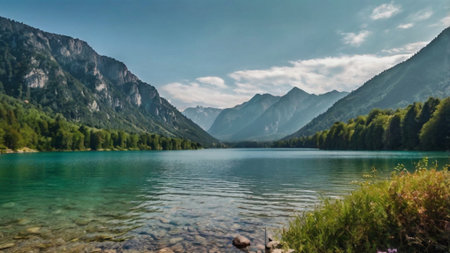 Panoramic view of the turquoise waters of Bohinj lake, Slovenia