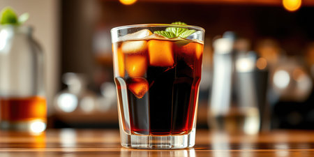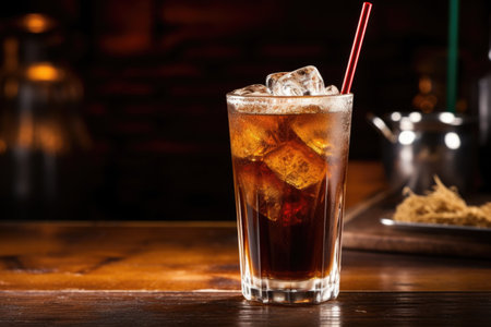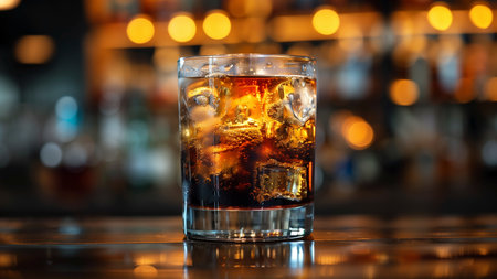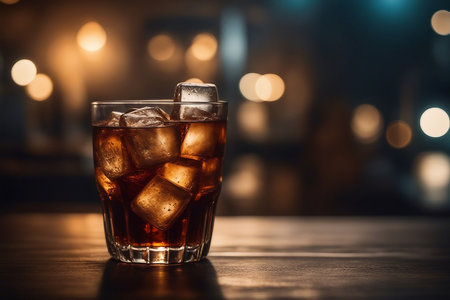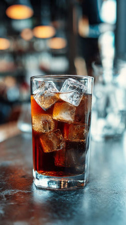 cola with ice in a glass on a bar counter in a pub