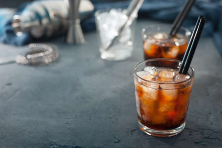 Alcohol cocktail with cola and ice with two cocktail tubes on a gray background in the background bar stock