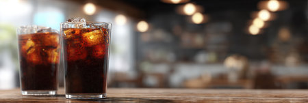 Glasses of cold cola on table against blurred background