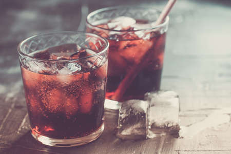 Alcoholic cocktail bourbon cola with whiskey and ice cubes, vintage wooden background, selective focus